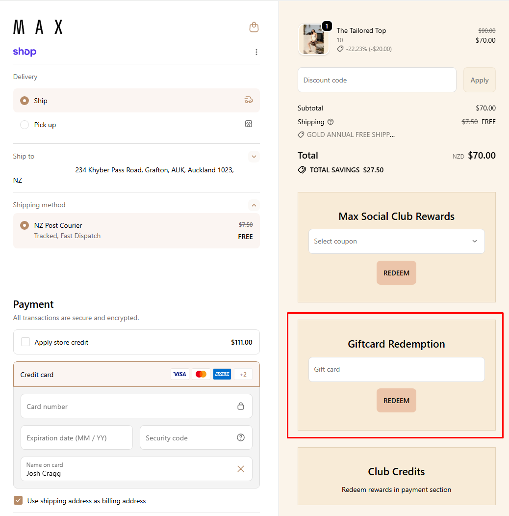 To use your physical or electronic Max gift card as payment online, please make sure you're logged into your Max Account, or this will not work. You can log in here