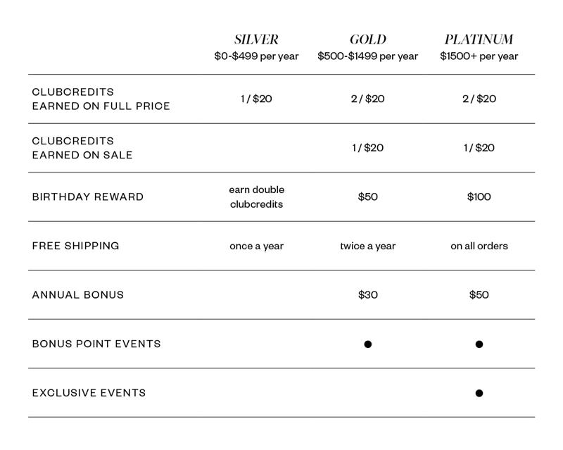 Welcome to Platinum Status, where the rewards are as good as your outfits. More ClubCredits, a $100 birthday reward, free shipping every time, and invites to Platinum-only events. This is what top-tier looks like, and you wear it well.